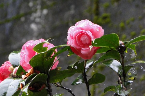 階梯旁的山茶花,在細雨中依然兀自亮麗的開著,我們撐著傘走向雨中走向歸程,結束這趟新春洗滌身心、賞櫻祈福的雨中漫行。