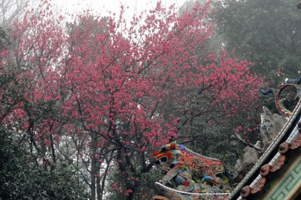 燒完了香到後院的庭園走走,遠山近樹都被濃霧籠罩著,觸目所及一片霧濛濛的,好美!山風吹來,才發覺冬末的寒意仍然存在,後山兩棵高大的山櫻在霧中開得緋紅,和廟宇古意盎然的飛簷形成絕佳的搭配。