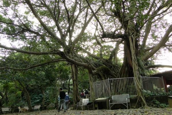 稜線中途有一棵高大的雀榕,濃密的樹蔭遮蔽了天空,聽說已是一百多歲的爺爺級老樹了,公所在榕樹周圍做了完善的規畫及保護措施,是早起爬山運動的民眾健身的好所在。