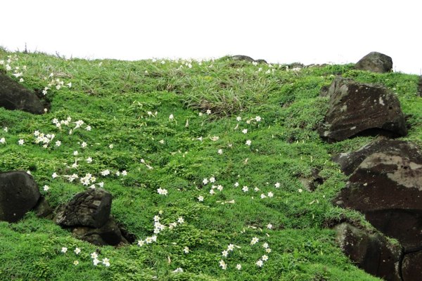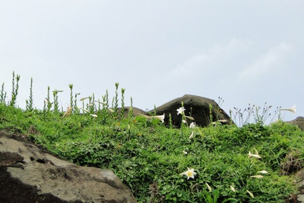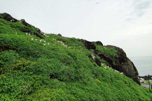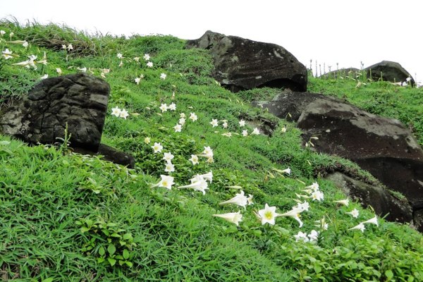 一個小時後雨勢漸小了,但天空仍是灰沈沈的,我們撐著傘朝岬角海邊前進,遠遠就看到面海的山坡上白影點點,是野百合在向我們招手,頓時我的心裡好興奮,加快腳步走去,而此時雨也不再下了。