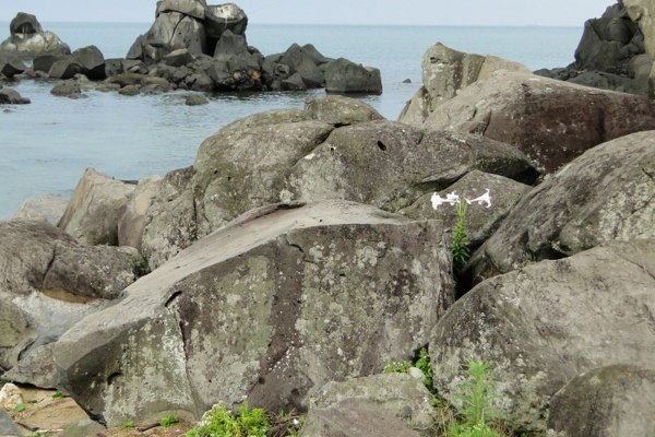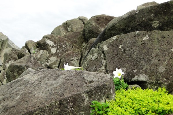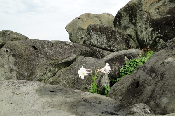「你看!」我右手指向海邊成堆的風稜石石縫間,小小的白色影子在風中搖曳,我肯定是野百合。