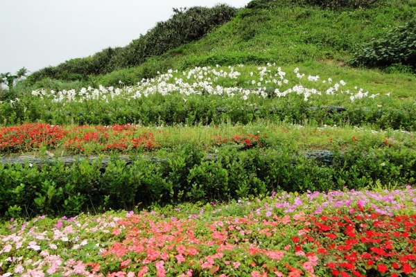 北海岸風景管理處在路口設置的小花園裡,種植的一大片野百合在海濱的風中綻放著,讓我信心滿滿,不料此時,天空卻降下了大雨,我們只好先走往北觀處遊客中心喝杯咖啡避雨、休息一下。