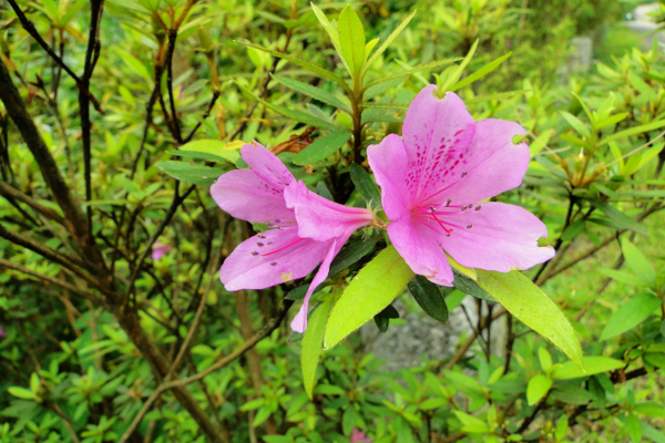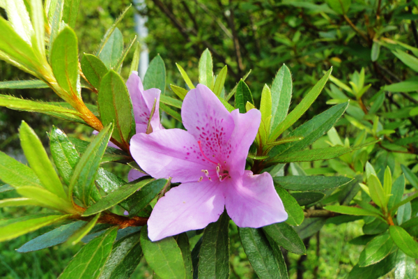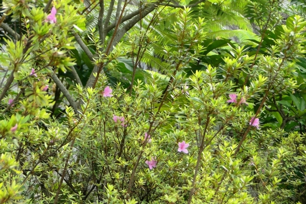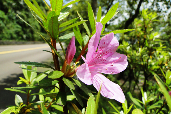 烏來杜鵑比我們日常見到的杜鵑花花朵較小,葉形較為細小為披針形,葉面有剛毛,花期為1~5月,此次參訪在園區道路旁還可見到她們零星開放的粉紅色花朵。