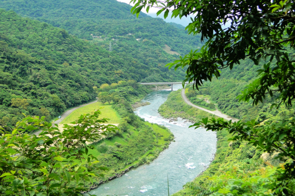 不久走到壩頂公園,從上方遠眺大壩下游的北勢溪宛如一條碧綠青龍,穿梭在群山之間非常美麗,前面是三號橋,中間是二號橋,一號橋則是位於新烏路旁的入口處。