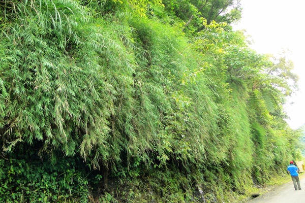 道路兩側生態非常豐富,除了初夏綻放的花之外,「台灣蘆竹」沿山壁生長,由上而下形成一道綠色水簾,隨風搖曳非常漂亮!