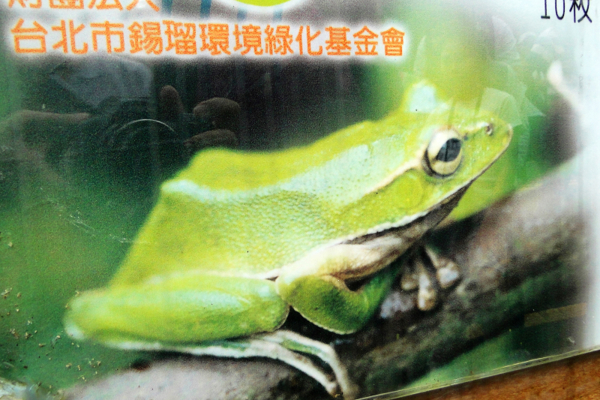 「翡翠樹蛙」~由於是在翡翠水庫附近發現到而得名,分布在台北南、北勢溪流域及宜蘭等低海拔山區,為台灣特有種。(照片翻拍自現場解說看板)