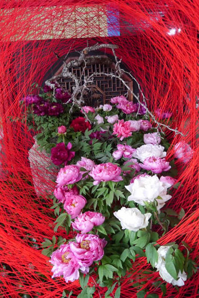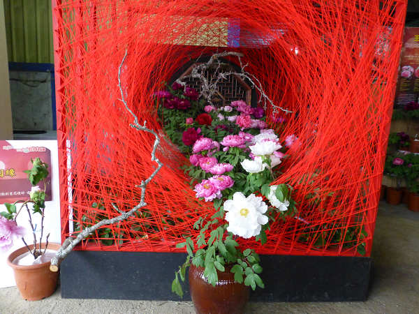 今年農場牡丹花展以「"富貴"因緣」為主題,工作人員正在佈置這個花開富貴的LOGO,以大紅色為背景,充滿了濃濃的中國風。