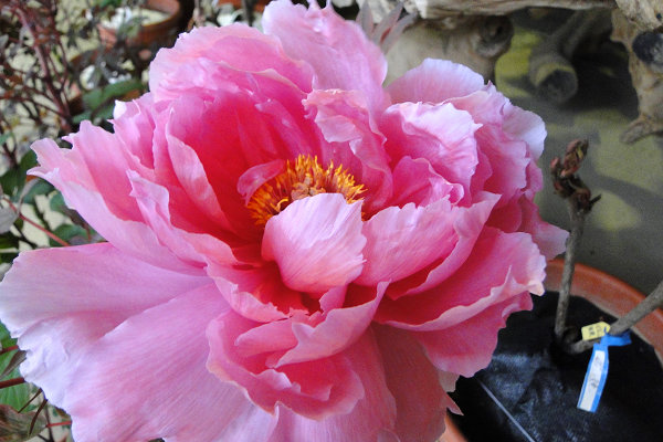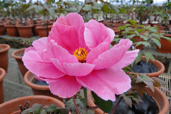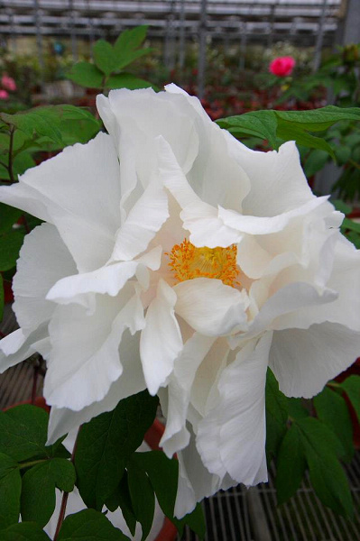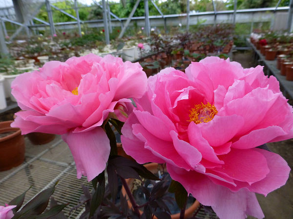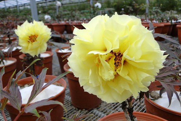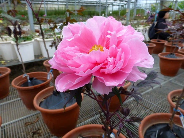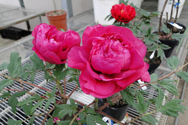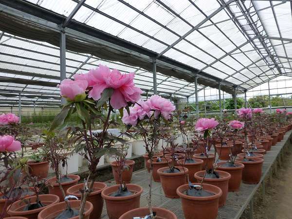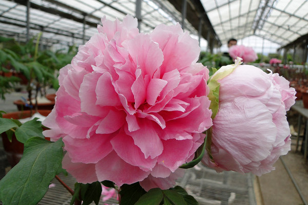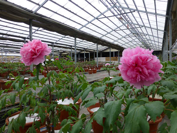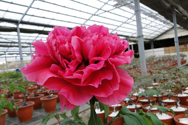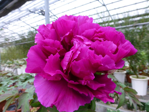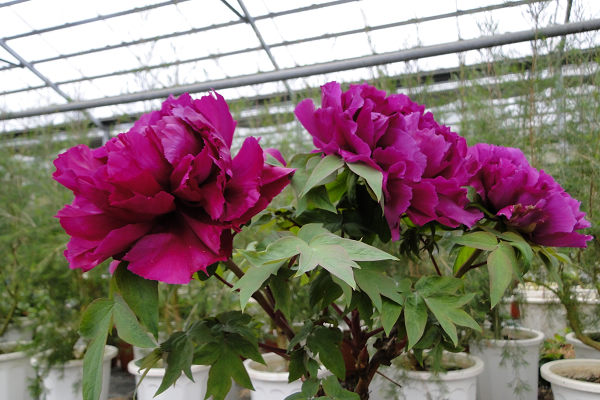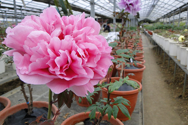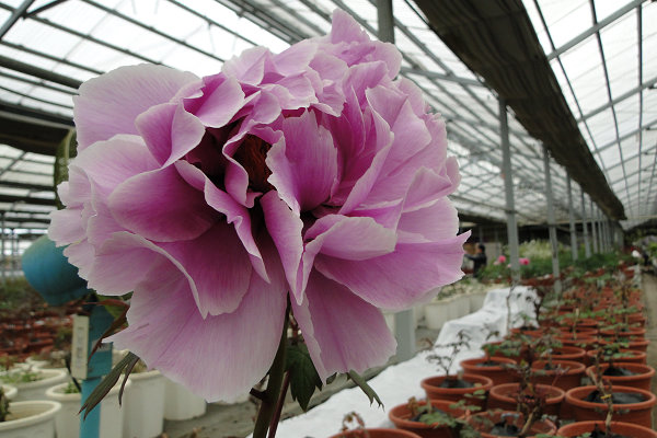 崧喬農場溫室以培育牡丹花和溫帶花卉為主,看起來相當寬廣,徵得工作人員同意,我們得以自在的在溫室裡賞花拍花,雖然只是將一盆盆的牡丹花放在架子上,沒有人工造景陪襯和花藝設計,但能夠這麼近距離的親近一朵朵碩大的花中之王,也是難能可貴的機會。