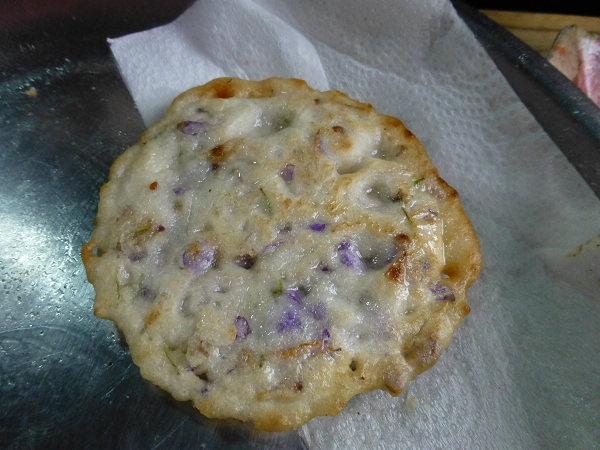 一旁有個小攤子,油鍋裡煎的正是以麵粉和紫藤花瓣做成的「紫藤餅」,很受歡迎呢!不知餅裡是否有著紫藤花淡淡的香氣?(我忙著拍花,所以沒空品嘗呢)