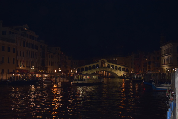 日夜交界之際,燈火初明之時,白色桌巾上燭光閃爍,杯觥交錯,也許燈光不足,錯以為座上的皆是紳士名媛。拿出還連接著備用電池充電的手機,勉強拍了幾張黎雅透橋附近,最熱鬧的威尼斯。完全沒時間講就什麼光圈、構圖之類的理論,機械性的按著手機上那個按鈕。說也奇怪,自己認為最能代表水都精神的照片,就在那幾張胡亂拍攝的影象之中。
