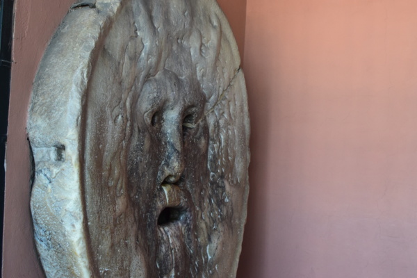 若不是導遊指點,真看不出這建築有什麼偉大,只見觀光客進進出出,門庭若市。導遊說,建築沒什麼偉大,他們都是來跟羅馬的精神象徵照相的,羅馬的精神象徵「真理之口」(Bocca della Verità)原本只是個人孔蓋,有個張嘴老人的浮雕;只因為電影「羅馬假期」男主角騙女主角奧黛麗赫本,手伸進老人的嘴,若說謊,會被咬;從此人孔蓋聲名大噪,成為羅馬的指標景點之一。導遊還說,要照相的話,傍晚關門前來,上午是尖峰時間,要花很多時間才能等到。