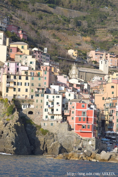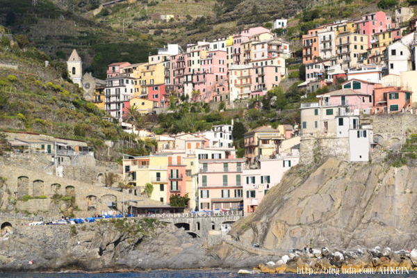 據說,很久很久以前,居民為了遠離戰亂,逃避海盜的騷擾,選擇到這樣的海厓山坳落腳定居。從海上看這五個易守難攻的漁村,海盜為他它們取名Cinque Terre,五塊陸地的意思。聽了這傳說,我嘗試想像,是什麼樣的戰亂紛擾,迫使居民到這樣的窮山惡水生活?佛納薩是唯一有個像樣漁港的漁村,鄰村蒙特羅索(Monterosso)有片海灘可以泊船,利歐馬吉歐列(Riomaggiore)和蠻那洛拉(Manarola)勉強在磯石上用水泥糊了個平台好上下船,康寧黎雅(Corniglia)村子高高懸在海面數十公尺上的山厓,不知道漁民怎麼出海?