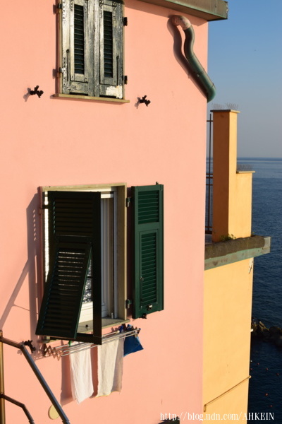 五漁的五個漁村都是建在陡峭的山坡下,一丁點的谷地;村子中央的廣場勉強算是平地,但是,一百公尺之外,目測都可以察覺廣場平地的但書;第二排的房子就得上石階.街道變成階梯,變成巷弄。不僅僅是室外的階梯,室內也是狹窄而陡斜的樓梯,一層一層地往上發展。對這樣困頓的自然環境,我有一份莫名的親切感──我們基隆人,對那樣的地形、那樣的樓房再熟悉不過了!這種依山建築,底層地基狹小,到了高樓層,拜傾斜坡面之賜,能向後方山壁爭取地盤;高層樓甚至另有高處的出入口。然而,空間的緊促,在五漁更甚基隆,甚至九份;因為五漁不但被山勢侷限,也緊鄰海岸。村落的位置,其實是山澗沖刷出來的谷地;雨勢大一點,就有洪患、土石流的災害。2011年底,我住的佛納薩(Vernazza)就遭受到百年洪患,唯一的大街兩側商店住家無一倖免;土石流高到二樓。若沒有那些歷史檔案,很難想像,這條白天時擠得像台北東區的大街,幾年前淹沒在土石流下面!