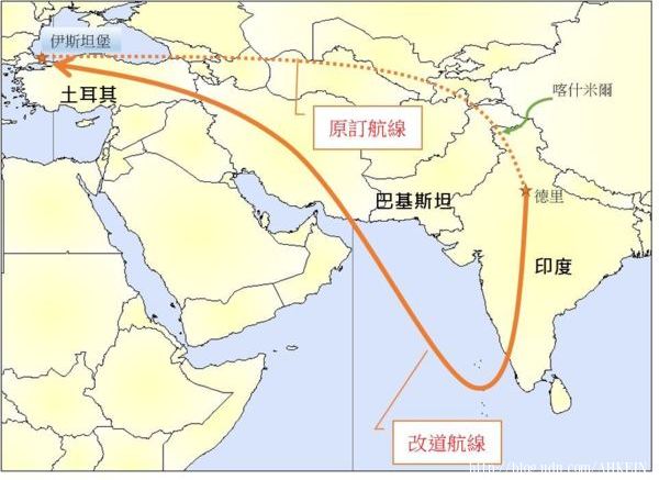 有人打聽到,因為印巴在喀什米爾開戰,巴基斯坦關閉了所有領空,過境的航班都要繞道,所以班級嚴重延誤。德里與伊斯坦堡之間是當今世界最不穩定的區域之一,有喀什米爾的公開戰事,還有恐怖分子佔領的伊拉克北部。所以我們的班機像西飛,遠離巴基斯坦空域之後,到公海才能朝西進;還要避免飛越伊拉克,班機右轉北飛越伊朗,再從小亞細亞西轉土耳其,回到班機的母港,伊斯坦堡。從地圖上看,飛航路線從東南-西北的拋物線,繞成一匙大水杓。這就是我們沒趕上銜接班機的原因!
