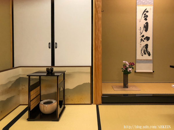 一樓是一間茶室,充斥著和式裝潢元素:竹子、紙門、扇面,榻榻米、假山流水...應有盡有,看得出來刻意要營造「茶室」的氛圍。一位優雅的老太太跪在玄關的榻榻米上迎接我們,經理說是他母親。我們也是母子對,話題自然為在家庭成員等等之上寒暄一番。他母親73歲,我老媽83歲。又是少不了的恭維:すごい(很厲害耶!)。