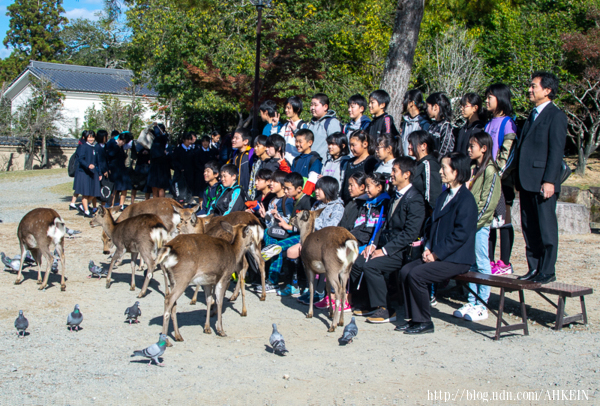 著名景點集中的前站,氣氛是熱鬧的,人潮帶來熱鬧,鹿追著人乞食,人隨著鹿擺姿勢照相,倒也有趣。不知道是否因為鹿不時會穿越馬路,奈良的車輛交通速度不高,這樣一來,就沒那麼大的壓迫感。這是個悠閒的城市。