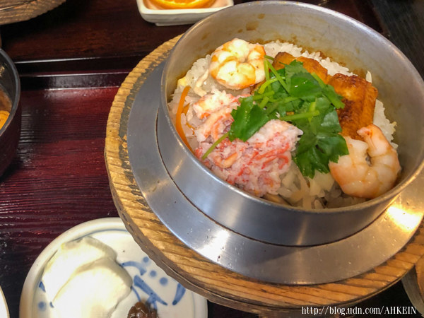 因為是現煮的飯,等候的時間,比一般的餐點稍長,不過是值得的!飯裝在鍋燒烏龍麵的可愛的小鐵鍋裡,就是一種令人期待的呈現,小鍋給人「限量」的錯覺;端上桌時,服務生囑咐,剛離火,在鍋蓋下燜個三四分鐘,會更好吃!我不知道是不是真的,卻是很成功的噱頭,我們盯著鍋蓋數秒,飢餓的期待隨著手機上的計時app,一個數字、一個數字地加深。