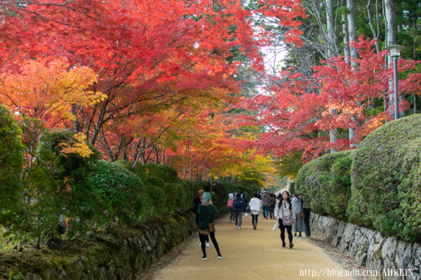 然而,那天下午晴空萬里,伽藍的橘紅色寶塔,大紅色中門,在湛藍的天空,耀眼的紅葉妝點下,實在「侘」不起來。有種傳染病,在那樣的美景中流竄,眾多遊客很難倖免;眾遊客拿著相機,也不管是否佔據了道路,已定要自拍他拍一番。有點瘋狂。