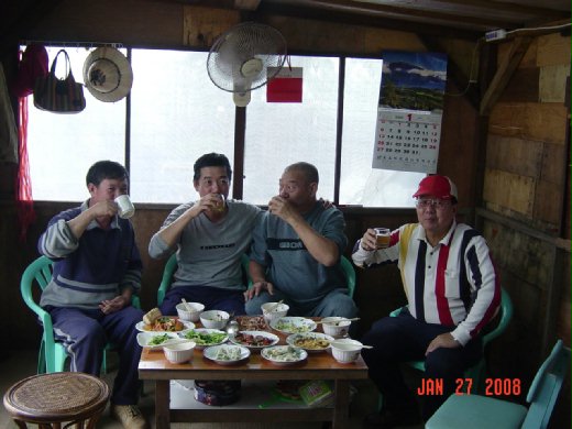 一、到了另一菜園更為驚訝不已,此處比上一園經營的更用心,菜園用紗網整個罩起來,可防止蟲害與天災,各種蔬果欣欣向榮讓人垂涎三尺。這塊地是上一年和幾個鄰居一起租的,原向台糖公司租的菜園,該公司另有運用已經收回。 二、園子後方有一小木屋,是健雄獨力一人花了半年辛苦搭建而成,裡面麻雀雖小五臟俱全;有水有電、還有電視與卡拉OK,並可在此泡茶聊天。 三、只見健雄嫂忙裡忙外的在烹飪食材,招待我們用午餐,並分葷、素兩種(健雄已茹素多年),金師父帶來一瓶用高梁泡製的養生解毒酒,邊吃邊聊,小弟喝了幾杯不勝酒力,一旁假寐休息。倒是郭三和金師父喝的意猶未竟,主人又在櫃子拿出一瓶高梁,繼續暢飲。 四、正巧培山在蓮池塘附近與好友埪土窯,金師父電召許將軍伉儷加入行列,陣容更堅強,兩人一聊,原來還擁有共同的義父母,算來還是失散多年的兄弟,天下無巧不成書,今日又添一樁! 五、時間很快,不知不覺晚餐已經上桌,吃著最新鮮的蔬菜,圍著一桌話當年與未來,人生一樂哉!