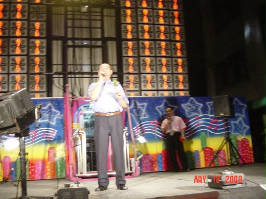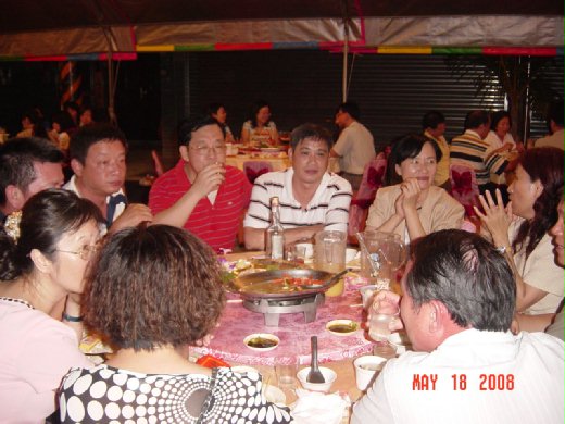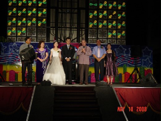 一、抵達喜宴會場,主人金師父熱烈招呼同學就座,由北部與自行前來同學已經坐了好幾桌,光同學桌次就準備了八桌。同學坐的滿滿的。 二、不久佳餚上桌,來賓一邊聽歌一邊品嚐美食,同學們也相互敬酒。 三、上了幾道菜後新郎、新娘暨雙方父母上舞台,由老長官譚明將軍致賀詞,恭賀這一對新人佳偶天成! | |||||||||||||||