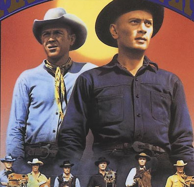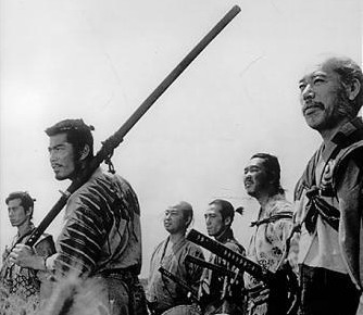 這是電影 '七武士' 的片頭之一﹐日本導演黑澤明於1954年的作品﹐由三船敏郎和志村喬等主演。圖片上左邊扛著超長武士刀者為三船敏郎演的無賴假武士菊千代﹐最右是志村喬演的假和尚真武士官兵衛。1961年美國有部電影將此故事時空背景搬到墨西哥﹐尤伯連納、史提夫麥昆和查理士布朗遜等人主演﹐片名叫 '豪勇七蛟龍'。據說近年徐克的 '七劍' 與此也有些淵源。