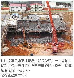 台北縣林口遠雄集團一處建案的工地昨天下午發生重大工安意外,灌漿中的一樓地板模板,疑因承受不了水泥重量,坍塌近百坪,已知6名工人被鋼筋、模板和水泥活埋,經漏夜搜救,一人受傷送醫,另挖出五人遺體。