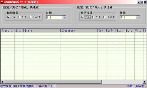 2. 啟動後在螢幕上顯示該程式視窗﹐可自行設定要隱藏及顯示視窗的兩組熱鍵﹐若不另行設定﹐其內定熱鍵是[Ctrl]+[F12]和[Ctrl]+[F11]。