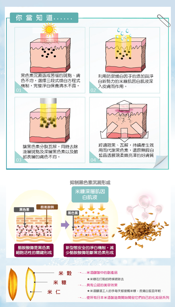 米糠肌因煥白保濕精華:含米糠基因白肌液、金蓮花萃取、木瓜酵素、大分子玻尿酸、維他命B5、蘆薈萃取液、防禦煥白因子、甘油等精萃成分,能滲透肌膚底層,幫助活性成分吸收, 三段式煥白方程式,阻黑、瓦解並代謝黑色素效果。完整淨白保養滴水不漏,還原無瑕、白皙、晶透的「淨˙白˙勻˙透˙亮」展現柔嫩亮澤好氣色好膚質。