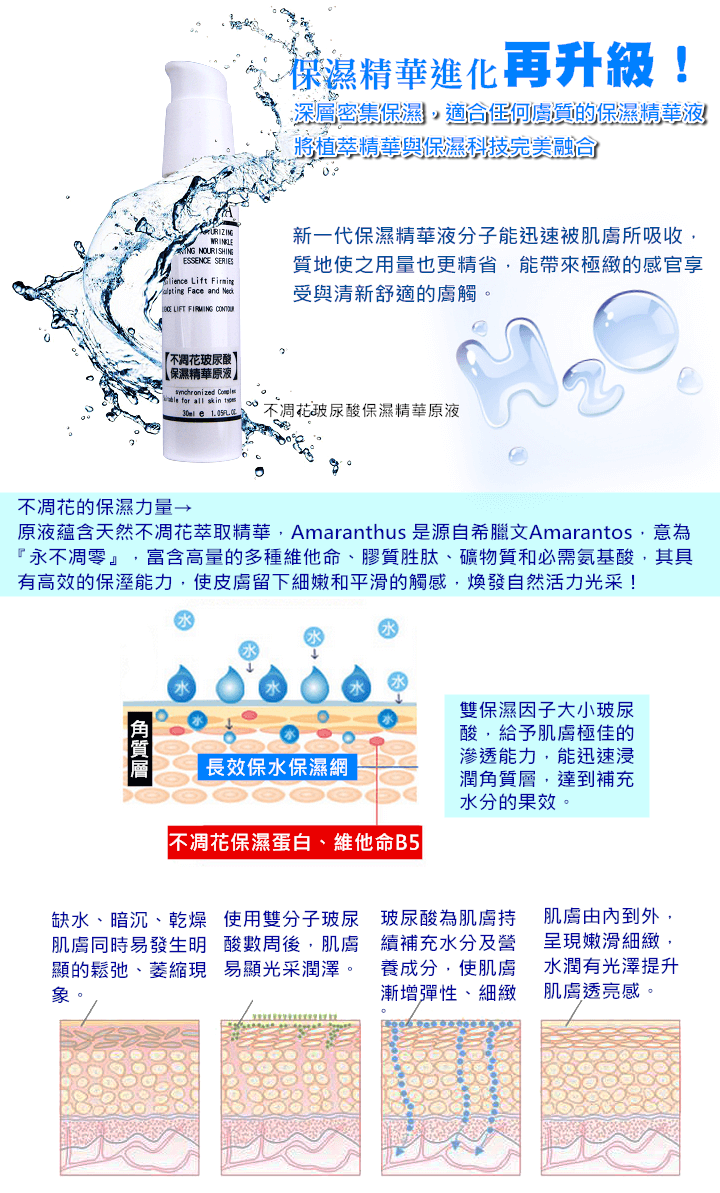 大分子玻尿酸、小分子玻尿酸、不凋花保濕蛋白、維他命B5、蘆薈萃取液、甜菜跟萃取、甘油