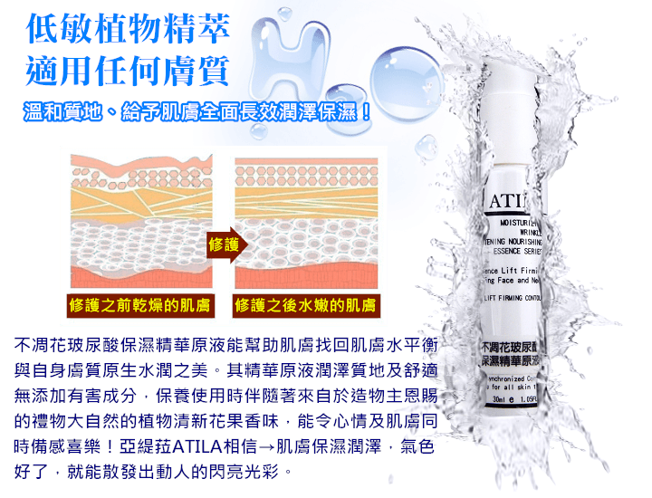 ●賦予肌膚充足水潤活亞緹菈ATILA創新呈現全新密集保濕精華,極致彰顯保濕補水科技的核心精隨。