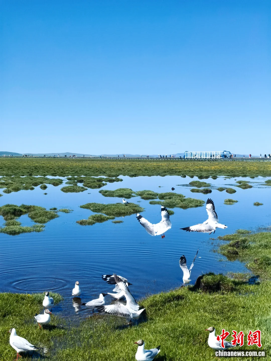 長長的棧道,沿著湖水直至天邊深處,像是通往天空之城的秘徑。湖岸周圍開滿五彩繽紛的格桑花,湖中水草豐盈,一團團、一簇簇極為美麗,偶有繁花點綴其中,清澈見底,游魚可數。