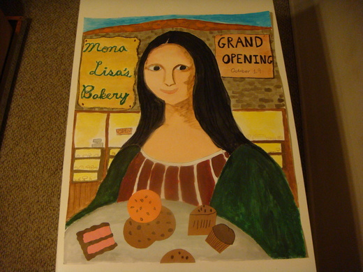 兩個女兒一聽我要畫「蒙娜麗莎麵包店」,都非常感興趣。有興趣最好,馬上多了兩個「童工」幫忙。蒙娜麗莎的畫也有了,從圖書館借的。海報紙、顏料、畫筆全備妥,挑個星期日一早就動工。