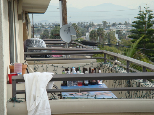 我在我們家的陽台常撿到煙蒂、酒瓶,還曾撿過一條T- thong。屋頂是鋪柏油片的斜坡,不但不平坦,而且有溜下去的危險,卻如此受人青睞,也只能怪我們這棟公寓地點太好,因是方圓幾哩內的高點,四周景物一覽無礙:東、北遠眺聖帕納汀諾山脈,西看聖塔莫尼卡海邊棕櫚樹,南望遠處飛機緩緩低飛、準備降落LA機場,尤其是夜晚,天上星月爭輝,地面燈火點點,氣氛真是浪漫斃了。