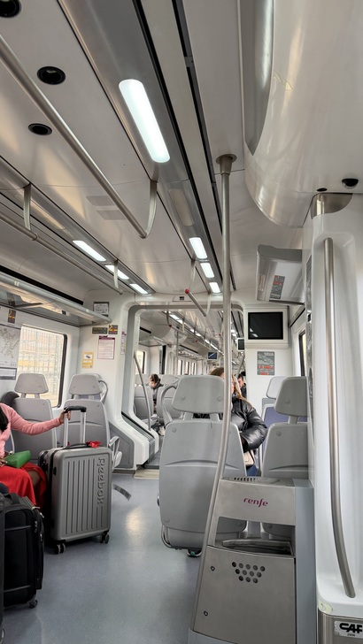 台北飛往杜拜,杜拜飛往馬德里,兩段航程上各吃了兩餐,終於抵達馬德里了,飛機準時降落(幾分鐘的誤差不算什麼)。出發前幾週,有新聞說歐洲幾個大機場因為 EES 的啟用,入境時間拉得很長。考慮入境花費的時間,前往 Oviedo 的高鐵只能搭當天的最後一班車。實際上,入境沒花多少時間,也沒有使用 EES,直接人工通關,沒多久,護照上就蓋了入境章。通關很快,但是在行李轉盤前等了好久。拿到行李時,果然已經來不及搭下午的車。一邊慶幸自己選了晚上的車次,另一邊倒又煩惱起來,離發車還有4小時,要怎麼打發這段時間呢?總之,先進市區再說。