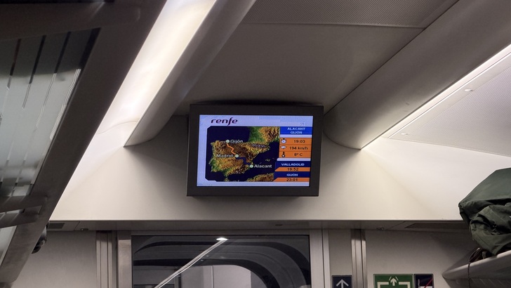 找到一間週六有營業的超市,在裡面胡亂買了一些食物和飲料,稍微緩和一下腹中饑餒。時間離發車還有一小時,回到車站。西班牙的高鐵上車前要先過安檢,詢問車站人員,我可不可以進站了,他說可以,於是我就排隊通過安檢,先進去了。到了月台,等了又等,列車總算到了,看好指定的車廂,上車囉!