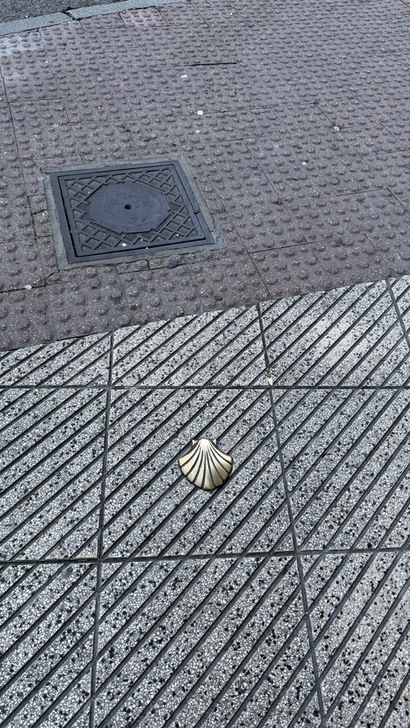 走著走著,在地上發現貝殻標誌,這就是朝聖之路的方向指示。不過還不急,後天才開始走呢。