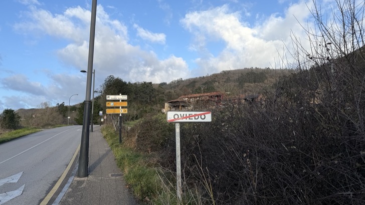 看到路旁標示牌。有些地名標示牌上有條紅線,有些沒有。我猜沒有紅線的代表接下來會進入的地方,有紅線的代表到達邊界,即將離開。那麼,這個標示牌應該是代表已經到了 Oviedo 市的邊界?