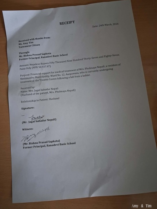 Amy已匯款至尼泊爾,校長收到5萬盧比匯款。