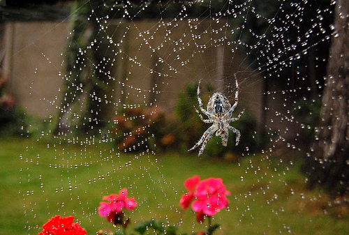 有一天,刮起了大風,風將一滴甘露吹到了蜘蛛網上。
