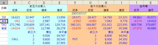 早盤的狂殺,多單執行停損,但沒一會的功夫,卻又狂拉,又狠下心再做一口多單,還得再加強&適應Covered Call的操作方式;外資這兩天暫時沒再狂買了,但成交量還維持在不錯的水平,好現象!大額未平倉近月偏多,而遠月偏空,推測為逢高避險;價格區間調至[9597~9387],若明天持續漲,7月部位是否需要做些調整?