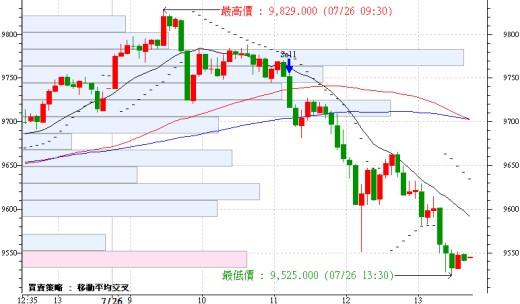 早上開盤10分鐘就達近400億的成交量,開始調節部位,不久就就出門了,到台北後才知道今天盤勢如此"壯觀"!摩台仍續弱,但今天買超,感覺可能會盤整;未平倉續增,雖然大跌,但還是維持偏多操作;價格區間調至[9633~9525]