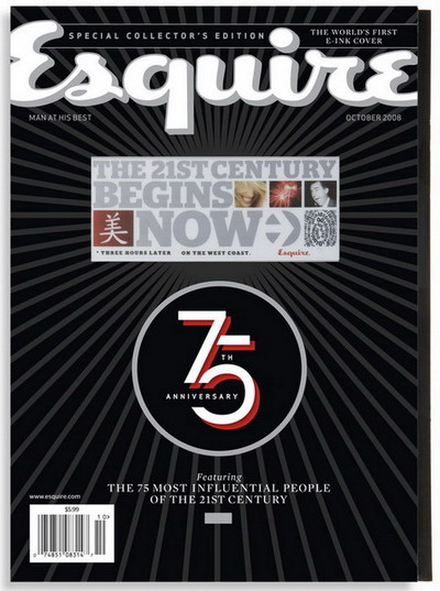 創刊於1933年的美國《君子》(Esquire,老爺)雜誌,今年75歲,10月號的雜誌特別慶祝,除了在內容上回顧,同時打出「21世紀從現在開始」的前瞻口號,更進一步創舉,在雜誌封面加上電子紙,把THE 21ST CENTURY BEGINS NOW的英文與圖案閃爍打出,又在封裡加了一張電子紙,閃爍打出福特FLEX汽車的廣告。這件事在幾個月前,就由《君子》雜誌、電子e-Ink公司、以及福特汽車共同宣佈,製作10萬電子紙收藏本,僅在美國零售,不包括幾十萬訂戶。