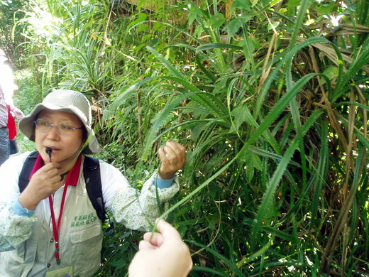 馬仙妹是社頂社區當地人,從小在社頂長大,圓圓的身材身手佼健,笑瞇瞇中帶著靦腆,從入園開始就不斷介紹各種路邊的草本的、木本的植物,還介紹植物名稱的由來、功能和流傳的小故事,對社頂自然公園內的寶物如數家珍,就聽到不同組別的解說員不斷的問:【學妹!學妹!妳知道這個叫什麼嗎?】