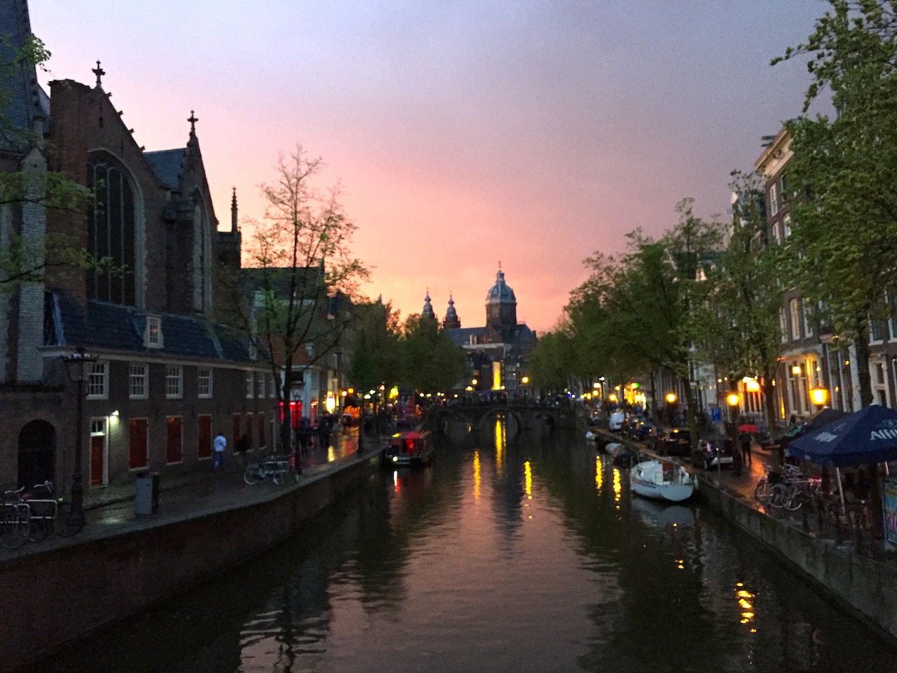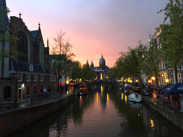走在街道,人身影交疊!電車縱橫交錯,人們無畏的穿行車道!紳士的西裝、飄逸的裙子,騎著單車穿越,阿姆斯特丹的單車比比皆是,看不到塞車的畫面!典型的荷蘭建築,別出心栽的榆樹種植,風景似畫!風吹,榆樹的花瓣像雪花飄散,俯拾即是!阿姆斯特爾河(Amstel),羅金河(Rokin)與天鵝防衛堤(Zwanenburgwal)的交匯處。我走累了,漫無目的地走到阿姆斯特爾河,看好河邊的長凳。黃昏,大概晚上9時30分之後。天空如此的藍,拍出來的照片,宛如明信片。夜迷人,我看得不願離去,燈光朦朧迷幻。陸上的屋與物,燈光的照耀,映在河上形成影子。