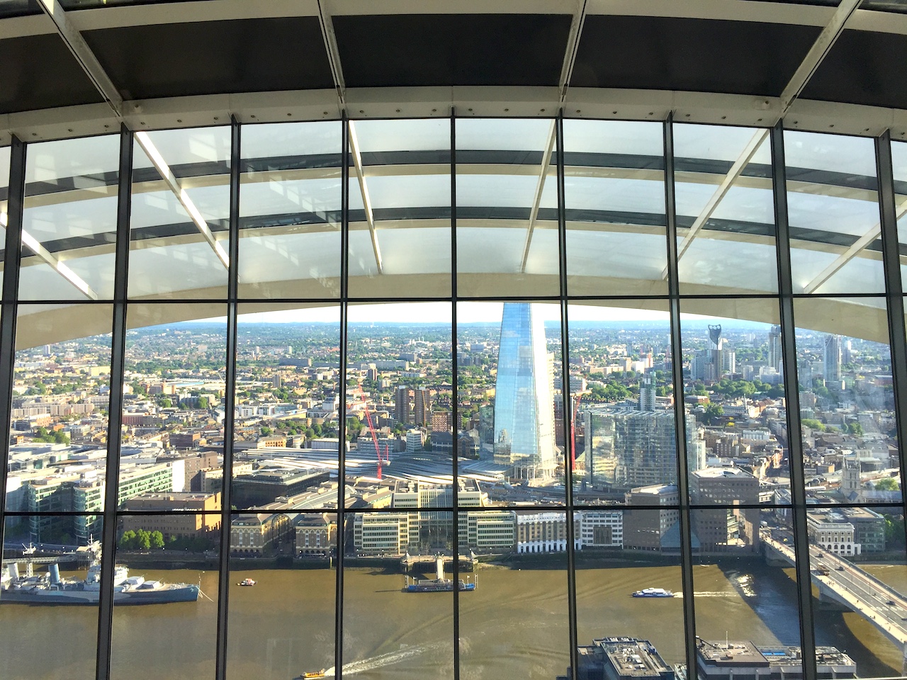 坐在36樓的餐廳,位子不偏不倚的在空中花園的中央。玻璃窗外美不勝收得嫑嫑!那是鼎鼎有名的泰晤士河。旁晚十分,距離黃昏還有幾個小時,豔陽高照,室內的光澤如此剔透,光線穿透玻璃,直射花園閃閃發光。