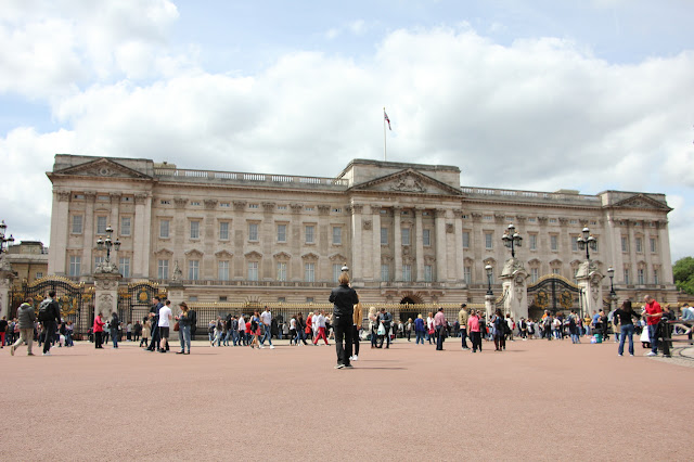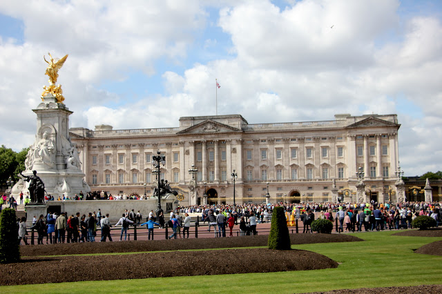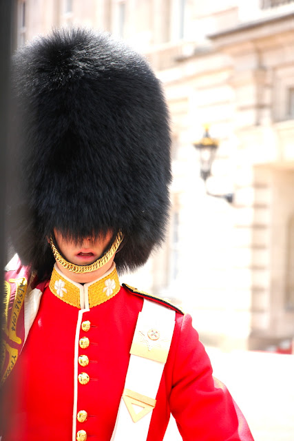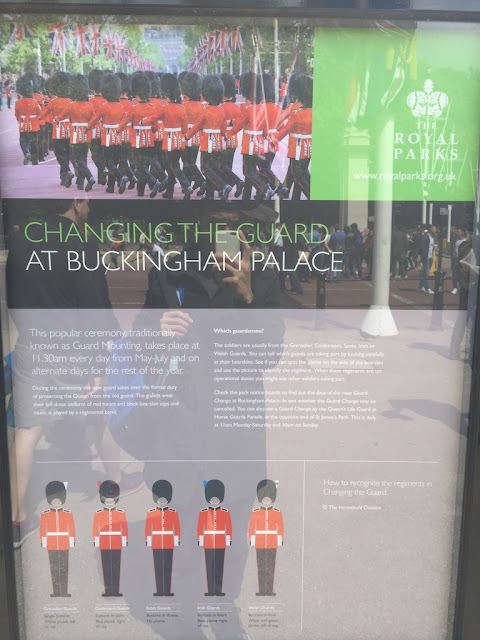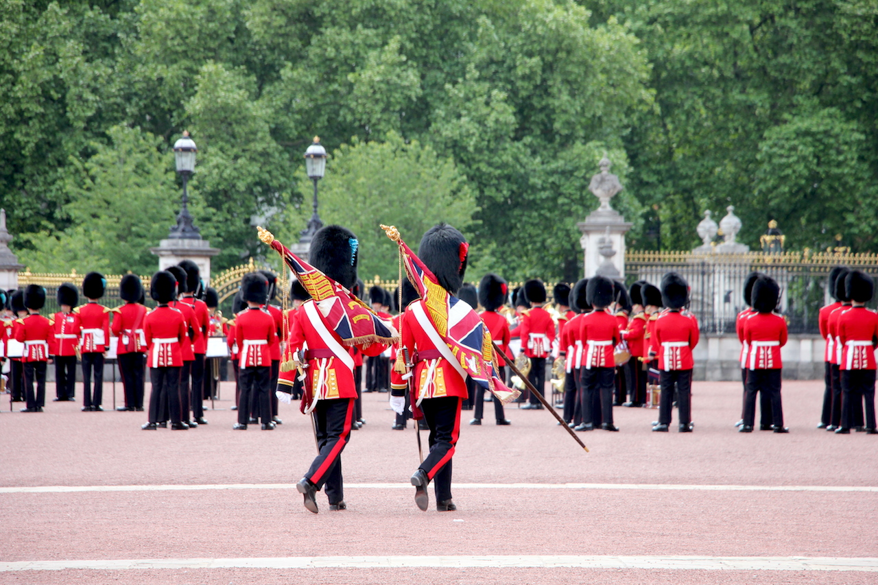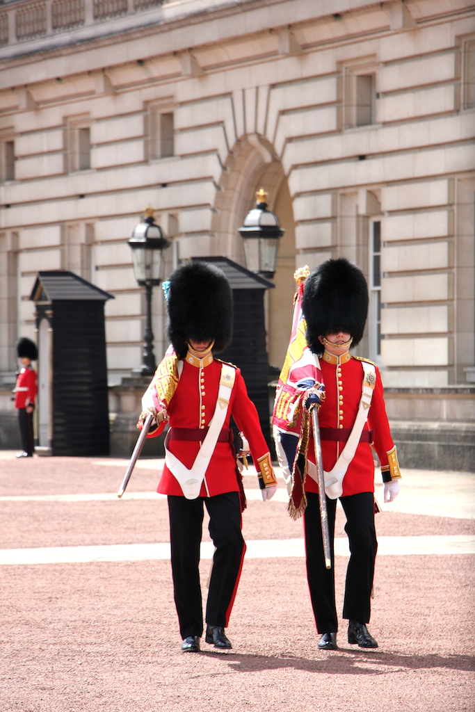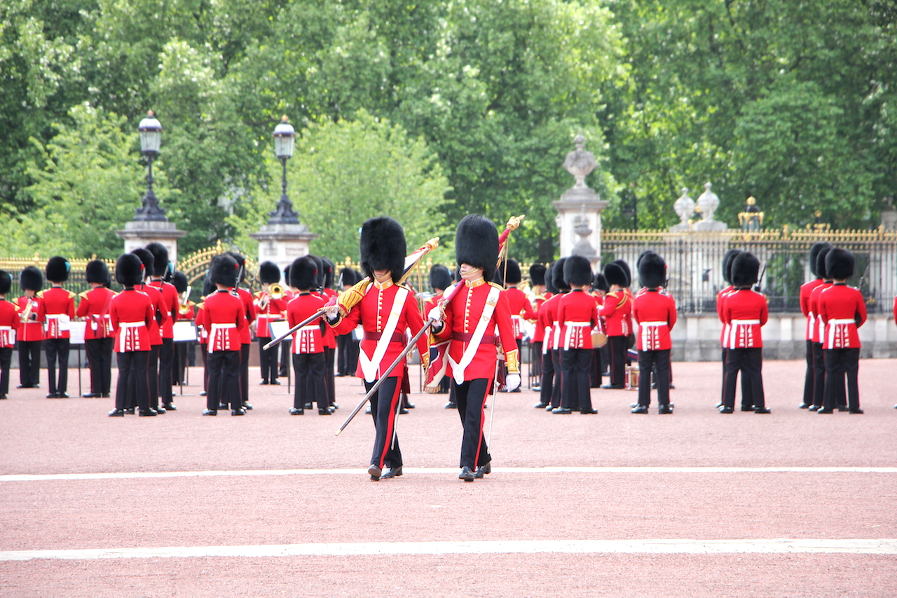 五月天,衛兵交接儀式每日舉行。清晨十一時開始,四十五分鐘的儀式,引來全球旅人的注目。白金漢宮正面廣場鑄鐵外人潮擁擠、維多利亞紀念碑也是擠得水洩不通。陽光普照天,聖詹姆士皇家公園的方向、綠園方向、海德公園角方向,大家紛至沓來,為親眼觀賞英國王室百年的衛兵交接儀式。這也是旅遊倫敦,絕不能錯過的王室文化特色。