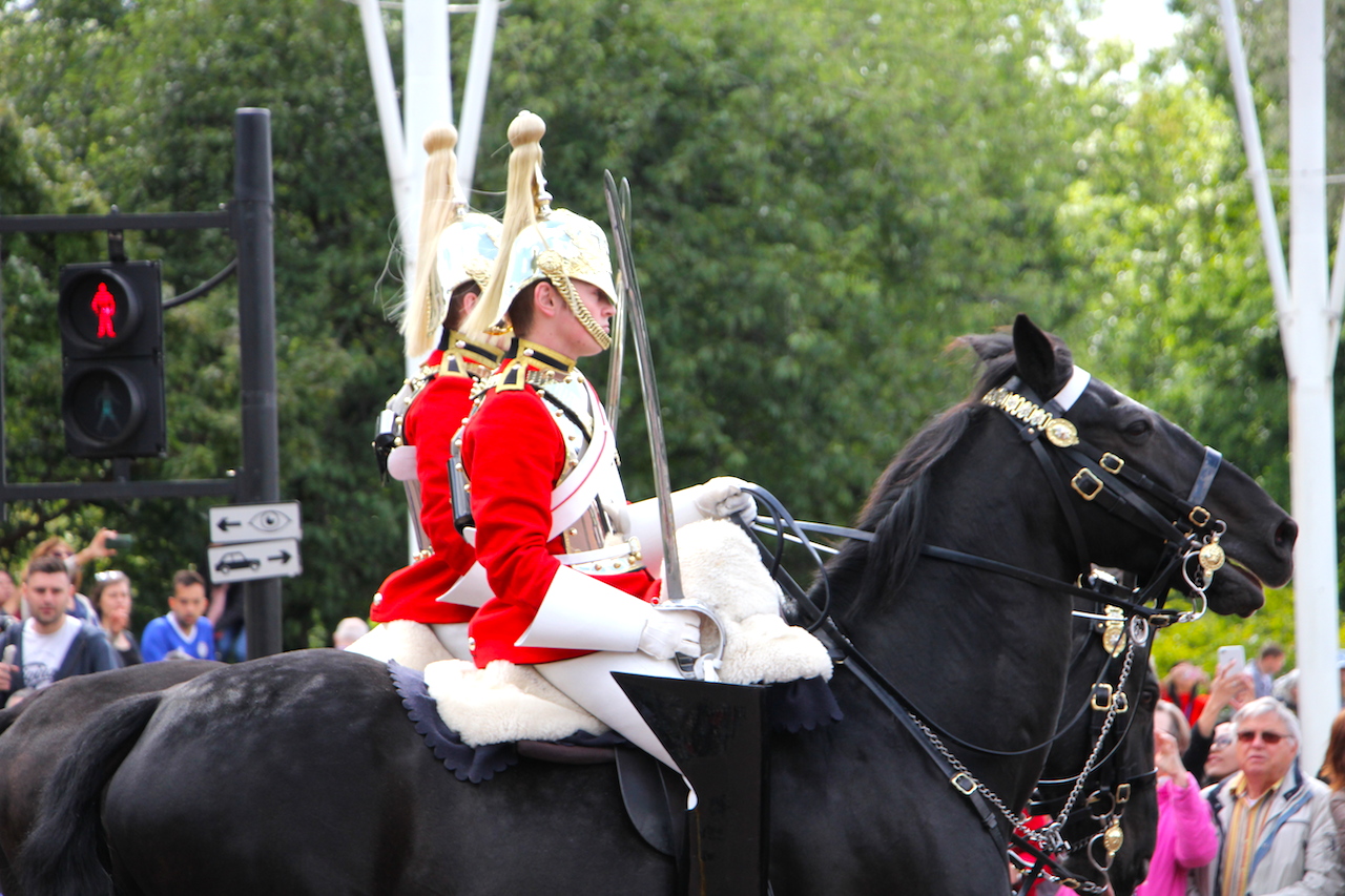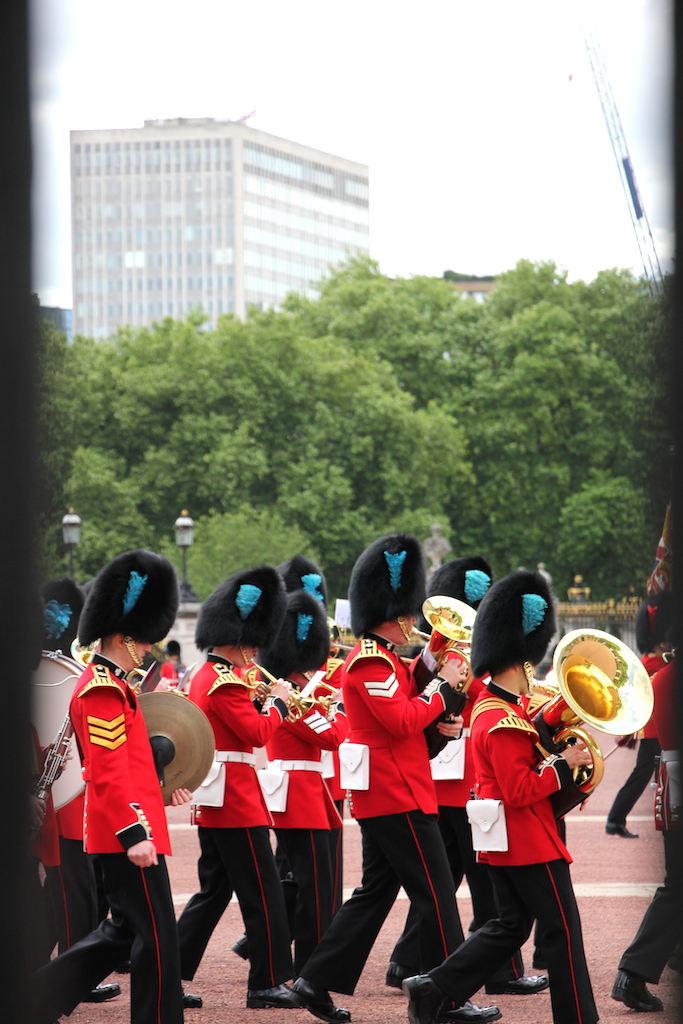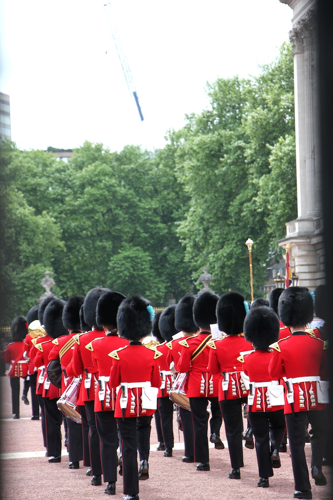 規律的馬蹄聲,騎兵隊在先。手持長劍、銀色頭盔、紅長袍配上胸甲,皮革高靴,個個壯士英勇的樣子。長笛優美的旋律,鼓的節奏感,已從遠方傳來。高高的熊皮帽,紅彤彤的長袍,衛兵表情莊嚴,壯闊氣勢進場。衛隊與樂隊,浩浩蕩蕩地步在林蔭路,邁向白金漢宮。