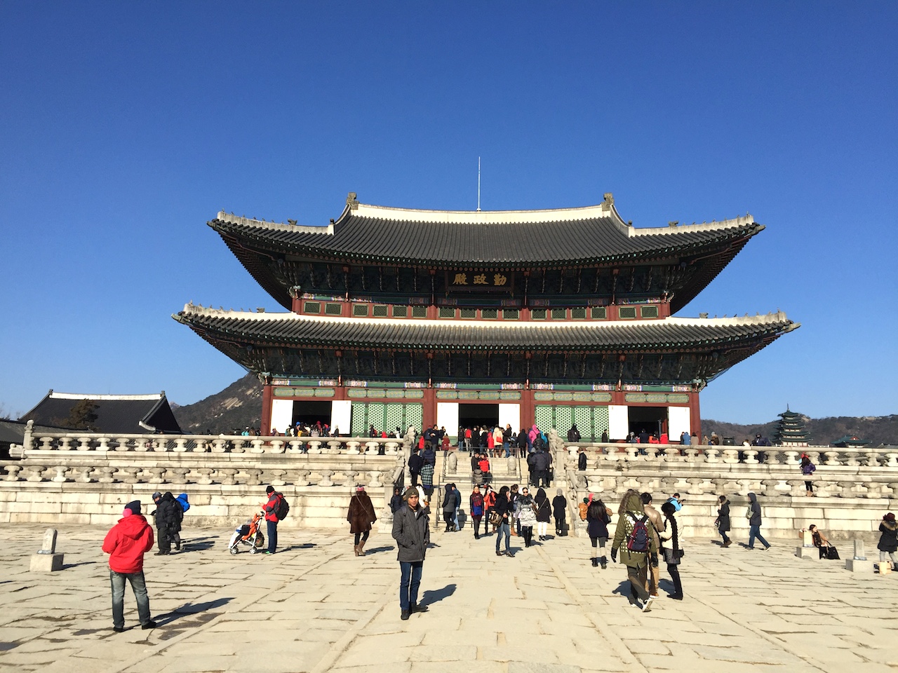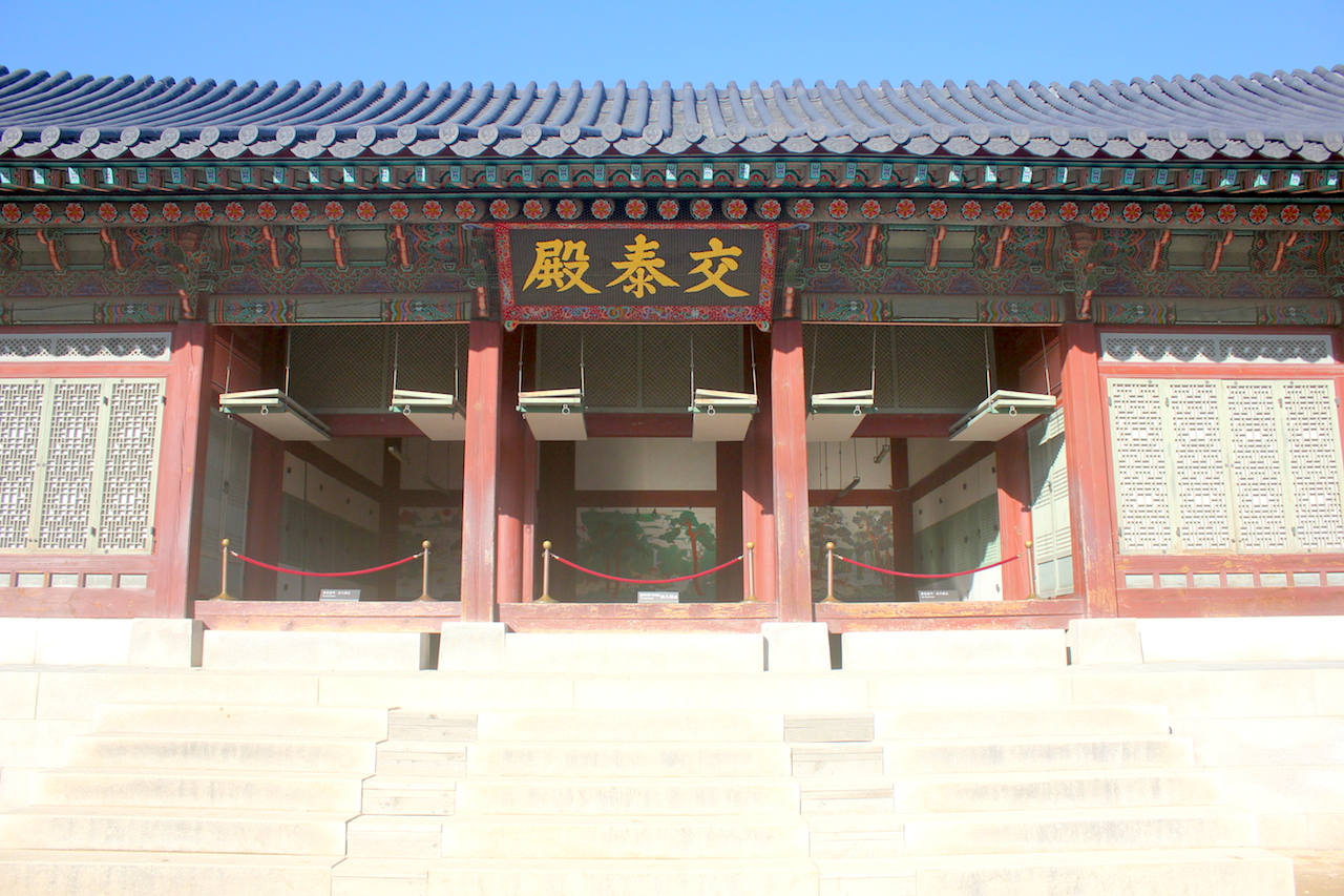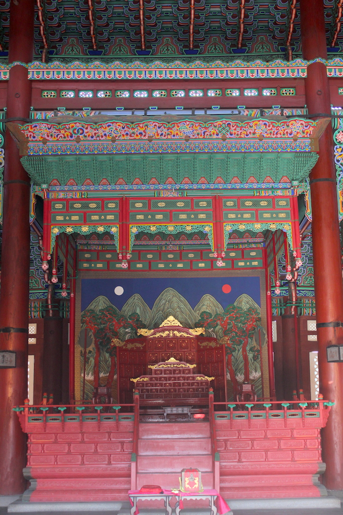 一路從光化門開始,踏上永濟橋,穿越興禮門與勤政門。到景福宮樞紐,即勤政殿,韓國寶物之一,景福宮內最宏偉的建築物。勤政殿,為五間五進、坐落於兩層丹陛之上。別稱“法殿”,是朝鮮君舉行對中國禮儀、朝賀儀式、王世子冠禮、國王納妃禮、接見外國使臣等宮廷宴會的地方。,殿前的廣場上,有品階石於東西兩側整理列著。文官居東、武官居西,並依照階級高低排列,從芝麻九品到正一品。在勤政殿後方為思政殿,是朝鮮君王與臣下平日議政、商討國事的主要殿閣。