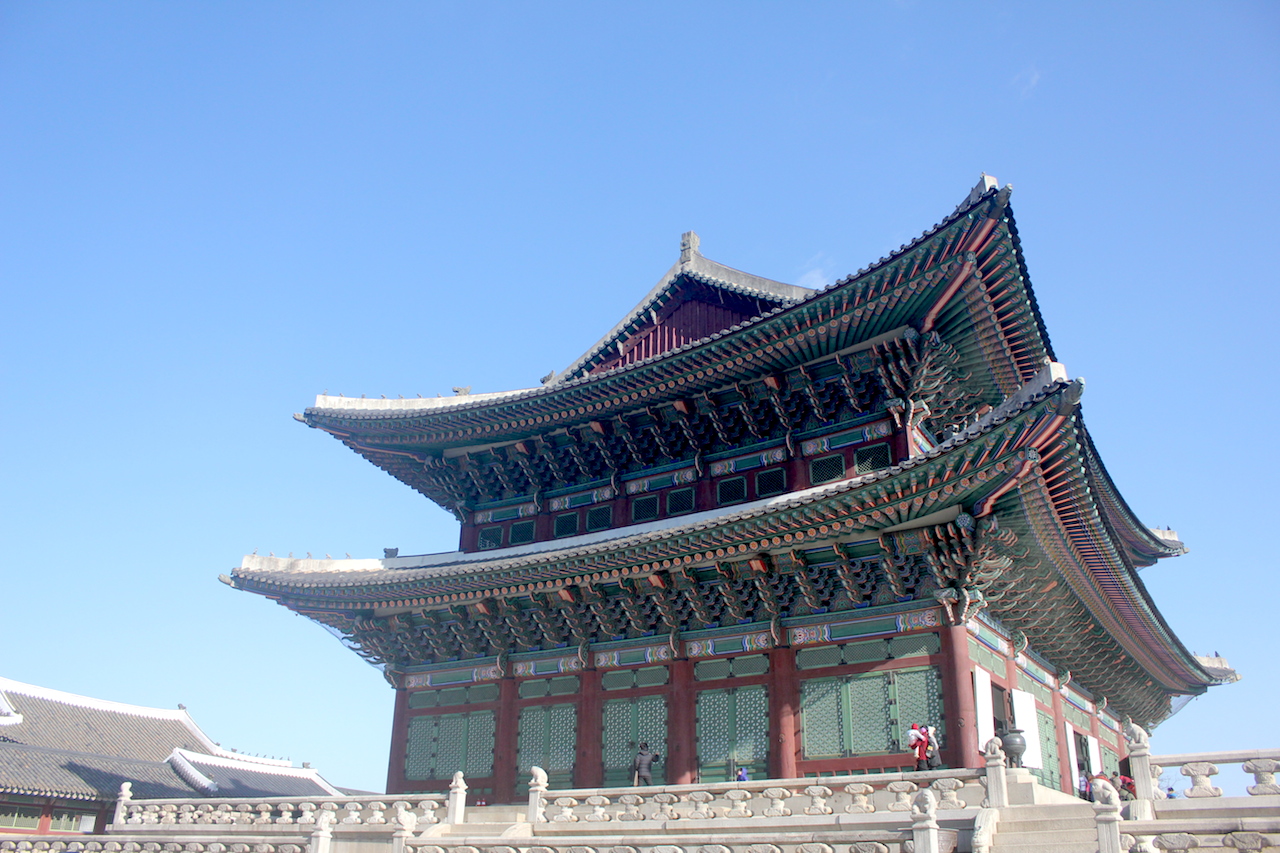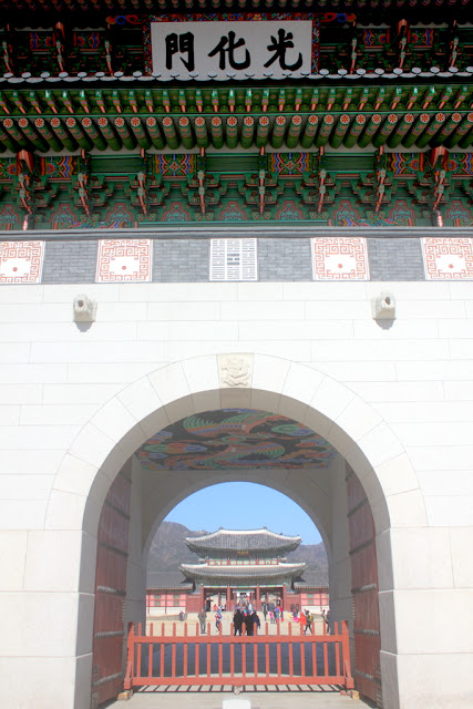 正門為南邊,白色石城牆,城門掛有漢字“光化門”。盝頂的建築風格,雕梁畫棟的斗拱、花朵圖案的椽子彩畫、屋脊上脊獸與走獸,皆受中國古代建築影響。再從興禮門進入皇宮。皇宮的東邊有建春門,西邊有迎秋門,朝北為神武門,可通往青瓦臺。廣闊的空地,身穿韓服的人,彷彿穿梭時空回到朝鮮。興禮門外的人潮,紛為早晨門將換崗儀式而來,這是遊景福宮必看的活動之一。