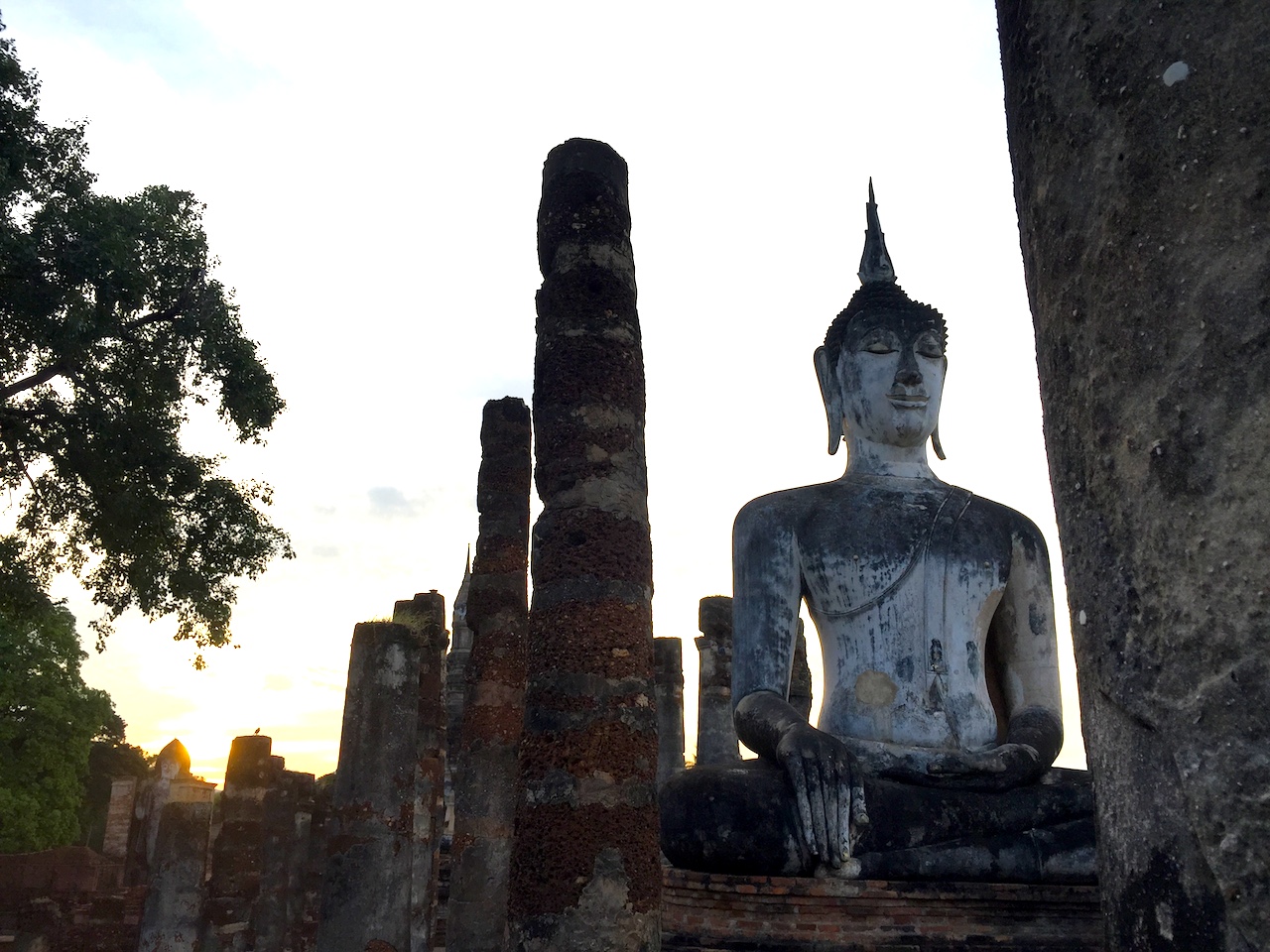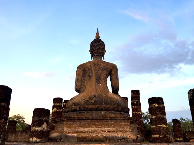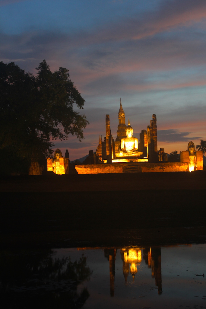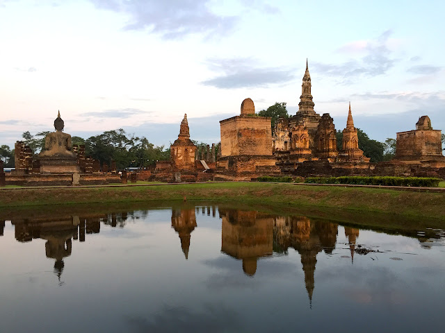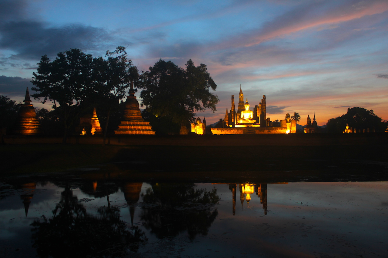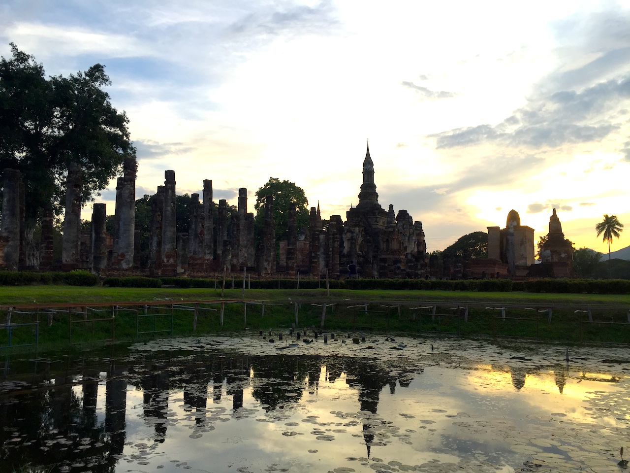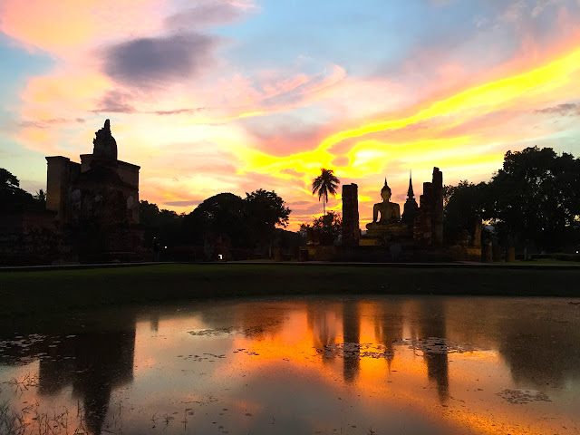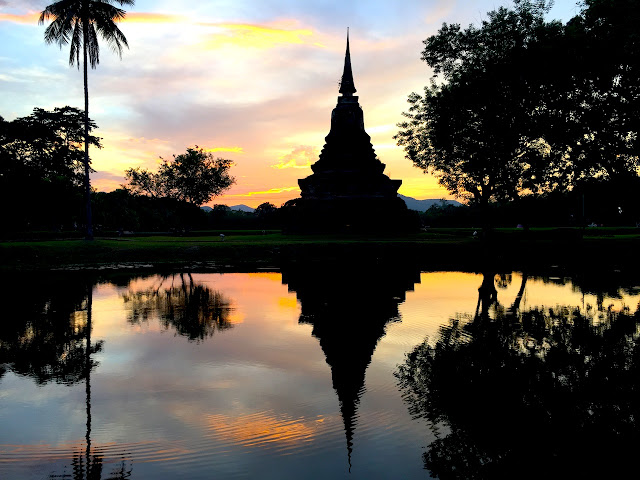 素可泰古蹟園區,被聯合國教科文組織 (UNESCO)訂定為世界文化遺產,是必走一趟,感受它的幸福所在。第一幕,夕陽餘暉,日光在Wat Mahathat的背後落下。坐在寺廟對岸,護城河邊,靜心欣賞美麗的景色。該寺廟是素可泰古蹟園區內最宏偉的,規模相當大。傍晚時分,人潮逐漸多,大家等待的是天空被染成橘色/金黃色。與廟宇的搭配,形成嘆為觀止的景觀。這是旅遊素可泰古蹟園區,最值得一覽的地方。